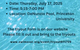 XCEL Tryout Join us for the upcoming XCEL Tryout! This is a fantastic opportunity for our XCEL swimmers to showcase their skills and join our team. Date: Thursday, July 17, 2025 Time: 5:15 PM - 7:00 PM Location: DeNunzio Pool, Princeton University Event Link: 2025 Summer Tryout Information Please spread the word to your family and friends who might be interested in joining the XCEL team. We look forward to seeing [...]